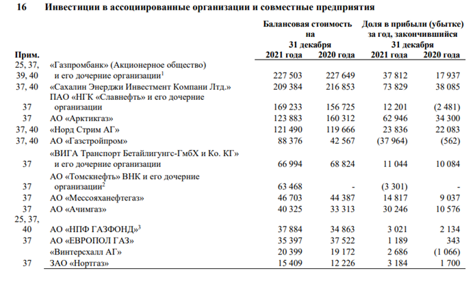 Кроме Газпромбанка, есть и другие инвестиции в ассоциированные предприятия. Т.е. те компании, в которых Газпром владеет значительным, но не контрольным пакетом акций.