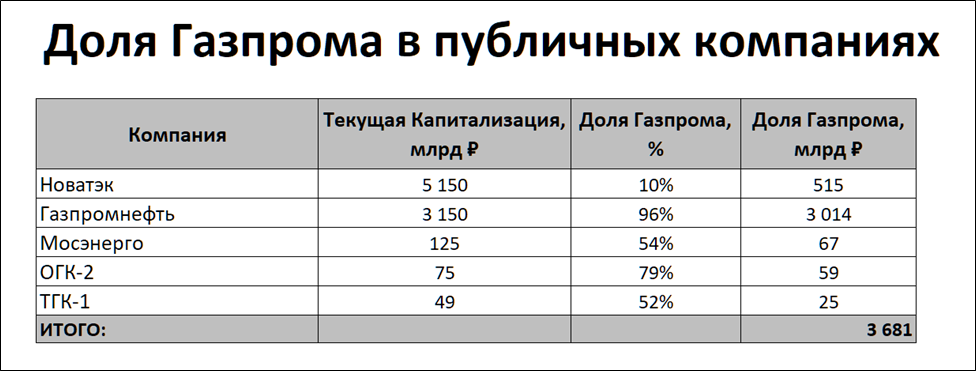Если взять капитализацию только публичных компаний, в которых есть более-менее заметная доля у Газпрома, а это Газпромнефть, Новатэк и ряд энергетических компаний, то получится совокупная стоимость 3,68 трлн. Т.е. стоимость доли Газпрома только в пяти дочках равна 85% капитализации всего Газпрома. Это говорит о сильной недооценке компании.