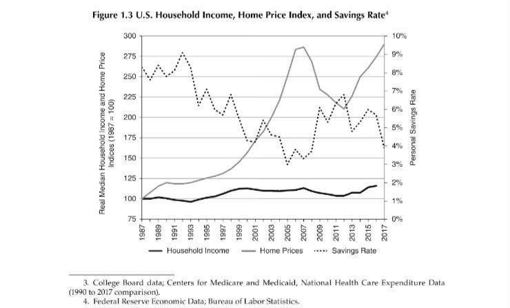 У меня есть две небольшие проблемы с тем, как эти данные представлены на диаграмме. Во-первых, цифра платы за обучение в колледже - это общая цифра, которая не включает финансовую помощь. Цена, которую студенты на самом деле платят за колледж, росла гораздо медленнее, чем официально считается, а после 2006 года вообще не увеличивалась. Во-вторых, выбор Перри выделить жилье и еду красным цветом, потому что они подорожали немного быстрее, чем общий уровень инфляции, немного сомнителен - оба показателя растут медленнее, чем зарплата, поэтому они стали более доступными за этот период времени, а не менее.