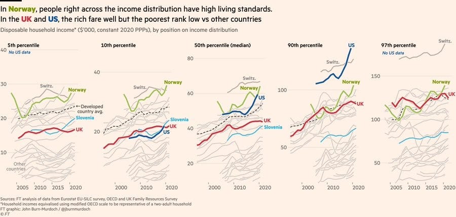 В Норвегии люди с разным распределением доходов имеют высокий уровень жизни.