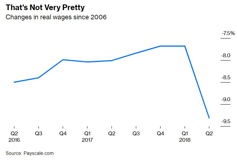 В июле 2018 года энергичный молодой автор Bloomberg по имени Noah Smith опубликовал следующую диаграмму в колонке о налоговой реформе Трампа, показывающую падение реальной заработной платы почти на 2% во втором квартале 2018 года: