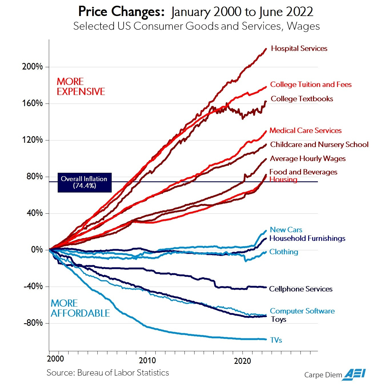 2. "Согласно тому, что некоторые люди называют "графиком века", единственными отраслями, где цены выросли выше уровня инфляции, являются также отрасли, в которые правительство сунуло свой нос с помощью регулирования."