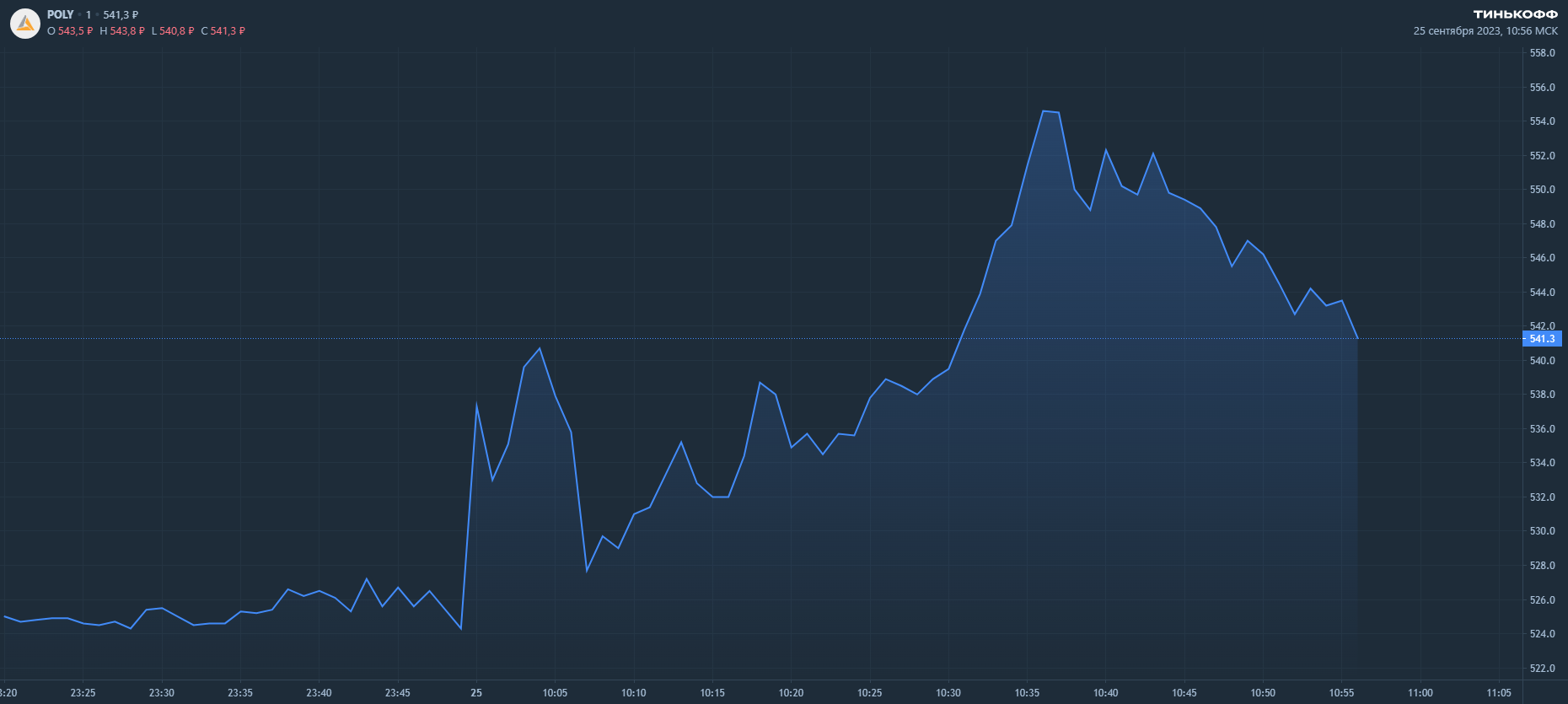К 10:56 по мск бумаги POLY торгуются по цене 541,3 руб (+3,24%).