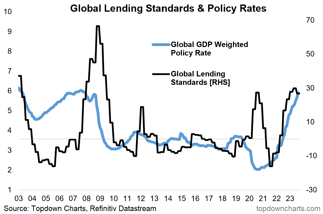 2. Двойная проблема: Ключевой причиной отказа от принятия сценария мягкой посадки были бы двойные проблемы, связанные с ростом ставок и ужесточением условий кредитования. Но опять же, вы можете возразить, что все, что это делает, — это повышает барьерную ставку для новых инвестиций, что может и не быть проблемой в мире высокого номинального роста и ограниченных производственных мощностей, и может просто даже не повлиять на тех, кто уже зафиксировал низкие ставки и укрепил свою денежную позицию во время денежных эксцессов периода 2020/21 годов.