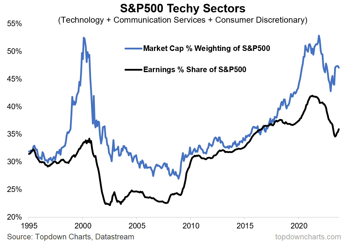 S&P 500 - около-технологические сектора (технологии + услуги связи и товары длительного пользования), рыночная капитализация и прибыль секторов как доля от капитализации и прибыли всего индекса