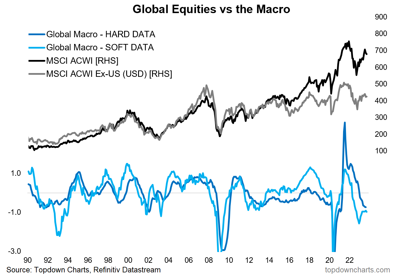 Глобальные макро-данные (твердые и мягкие) и показатели акций взвешенный по капитализации индекс компаний мира MSCI ACWI и MSCI ACWI выраженный в долларах без учета США