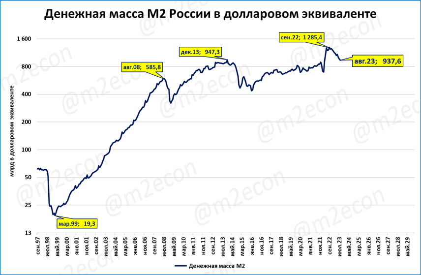 График показывает, что в долларовом выражении денежная масса сейчас находится на уровне 2013 года, то есть, на уровне десятилетней давности.