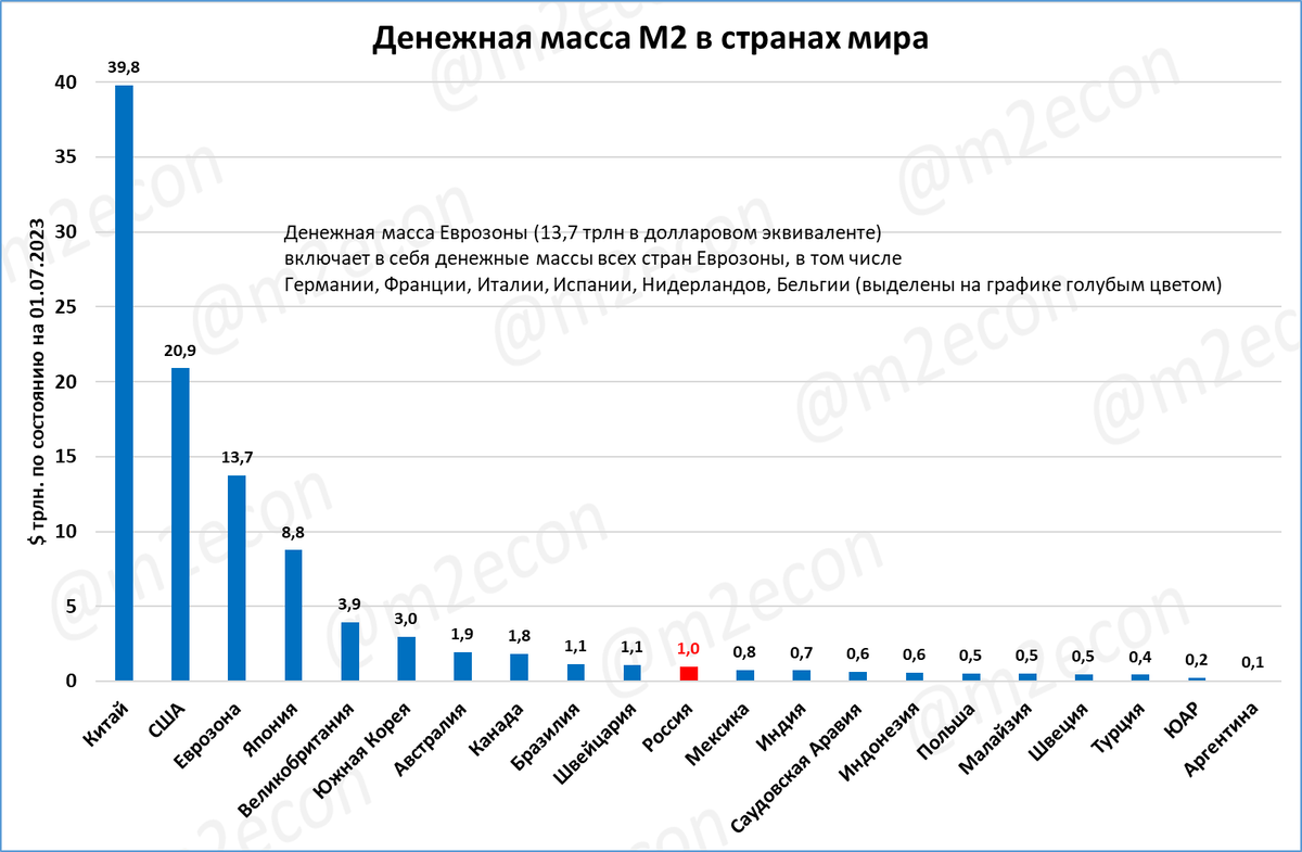 Денежная масса отдельных стран Еврозоны (Германии, Франции, Италии, Испании, Нидерландов, Бельгии) тоже присутствует в рейтинге и выделена голубым цветом. Но надо понимать, что это часть общей денежной массы Еврозоны.