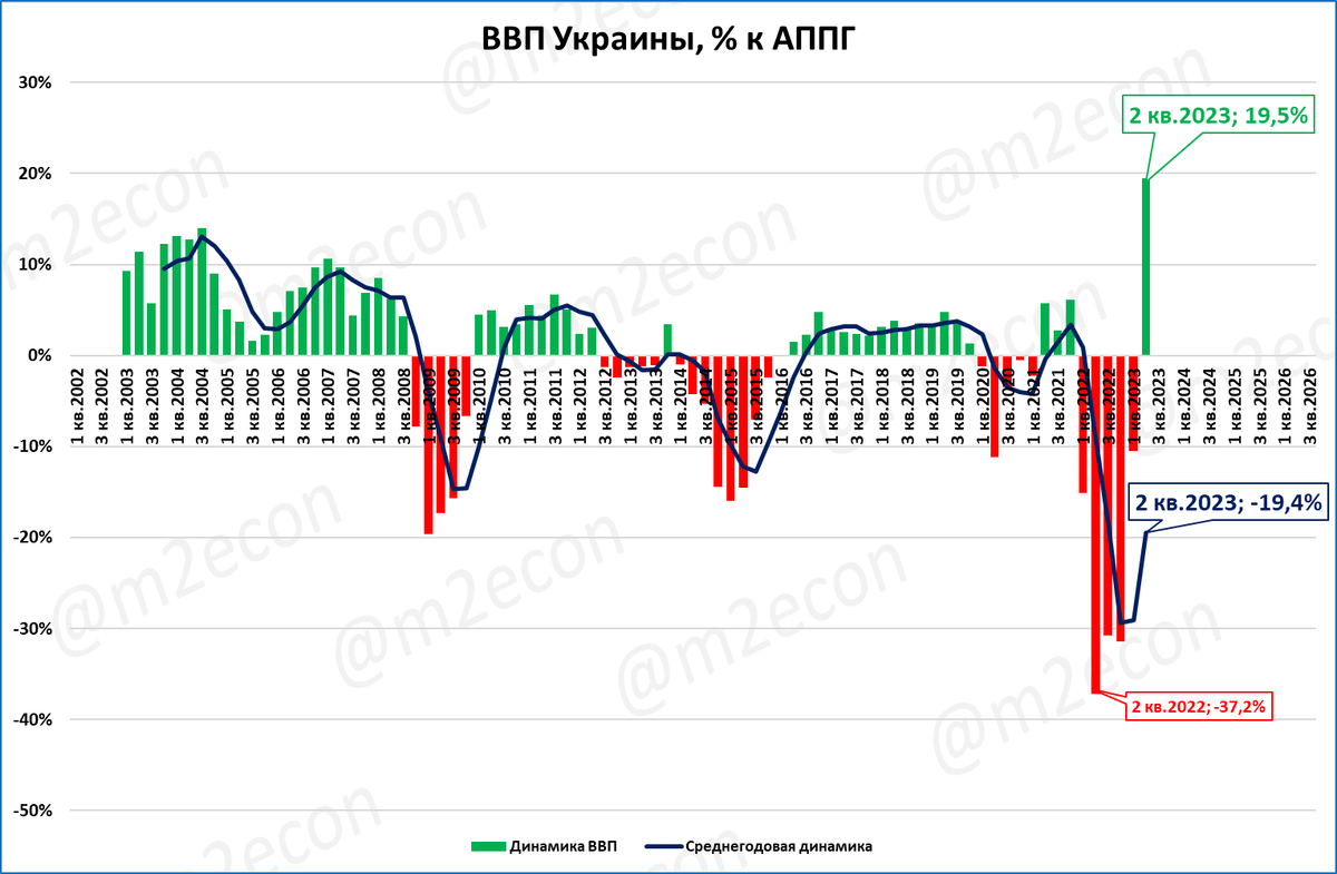 ВВП Украины во втором квартале вырос на 19,5% (к 2 кв.2022). Этот рост объясняется эффектом низкой базы прошлого года.