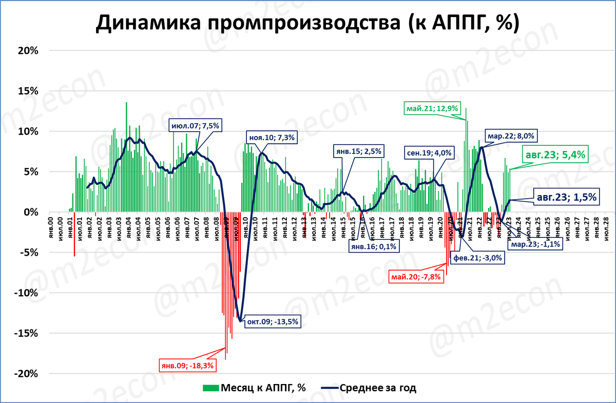 Промпроизводство – это около 30% российского ВВП. Это означает, что примерно треть российского ВВП росла в августе вполне приличными темпами 5,4%.