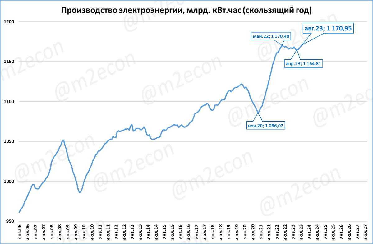 В последнее время мы традиционно сравниваем показатели 2023 года с показателями года 2021-го. В производстве электроэнергии обращает на себя внимание полугодовое “отставание” от графика 2021 года. Так, низшей точкой в прошлом цикле был ноябрь 2020 года (см. последний график), а в этот раз низшая точка появилась на 6 месяцев позднее, в апреле 2023 года.