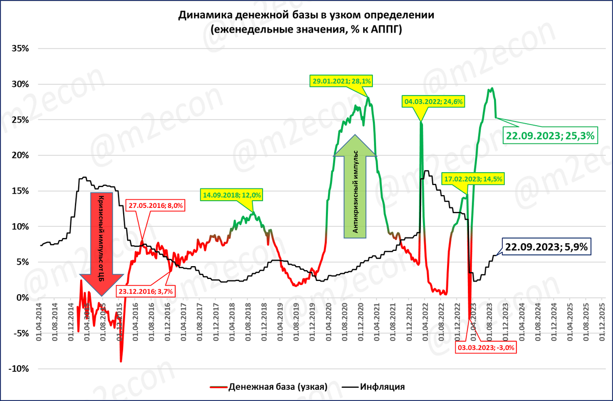 Узкая денежная база замедляется, но растёт всё ещё приличными темпами (+25%).