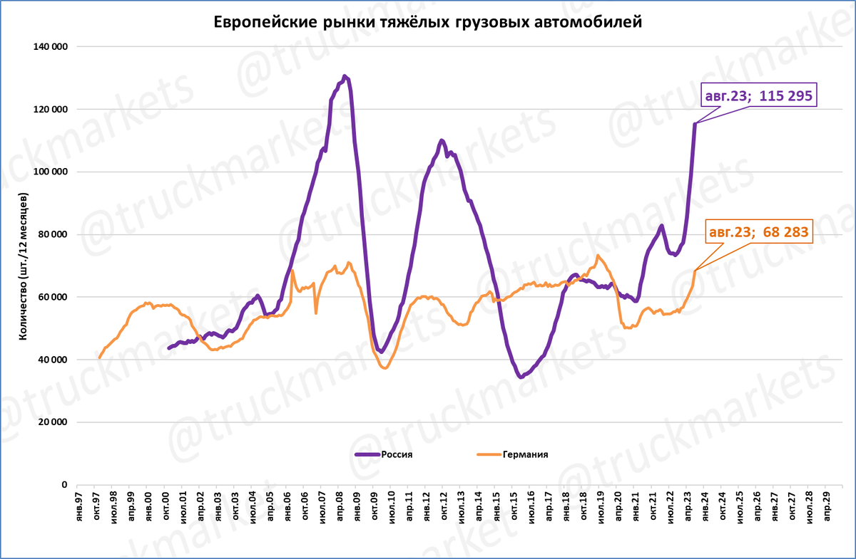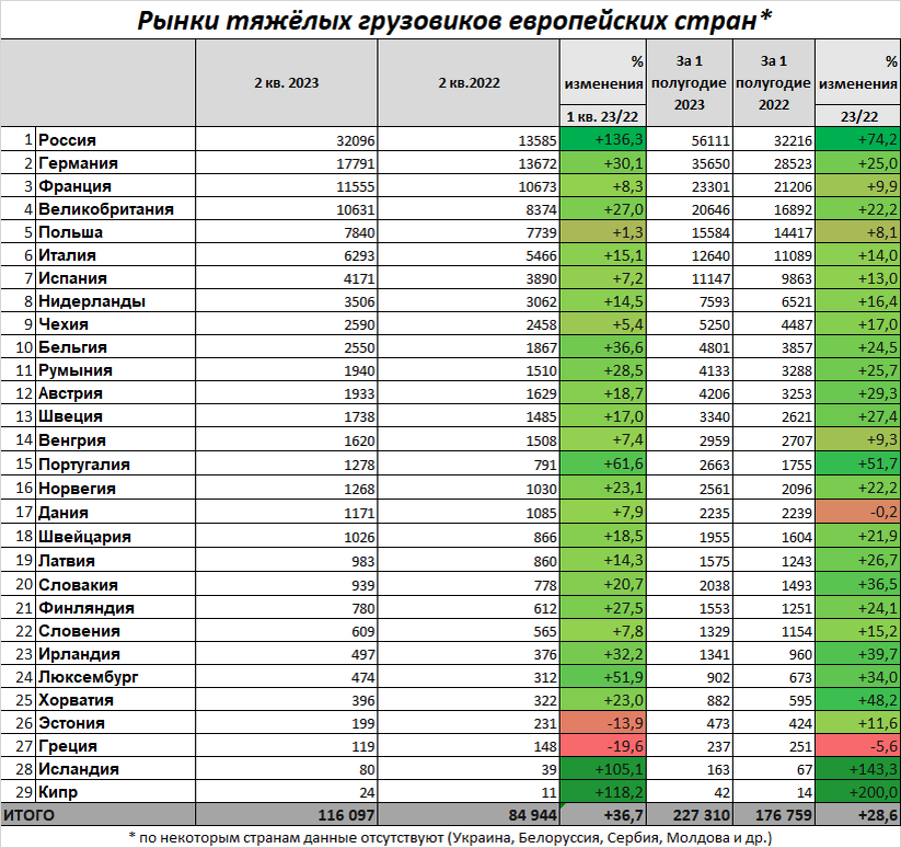 В рейтинге европейских рынков грузовиков по итогам 2 квартала и первого полугодия 2023 года Россия лидирует. Она с большим отрывом опережает Германию, занимающую второе место.