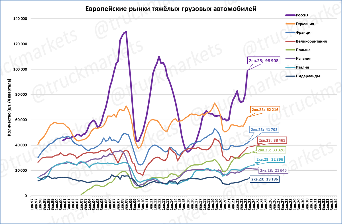Во втором квартале 2023 года Россия продолжала лидировать в рейтинге европейских рынков тяжёлых грузовиков с результатом 32 тысячи за квартал.