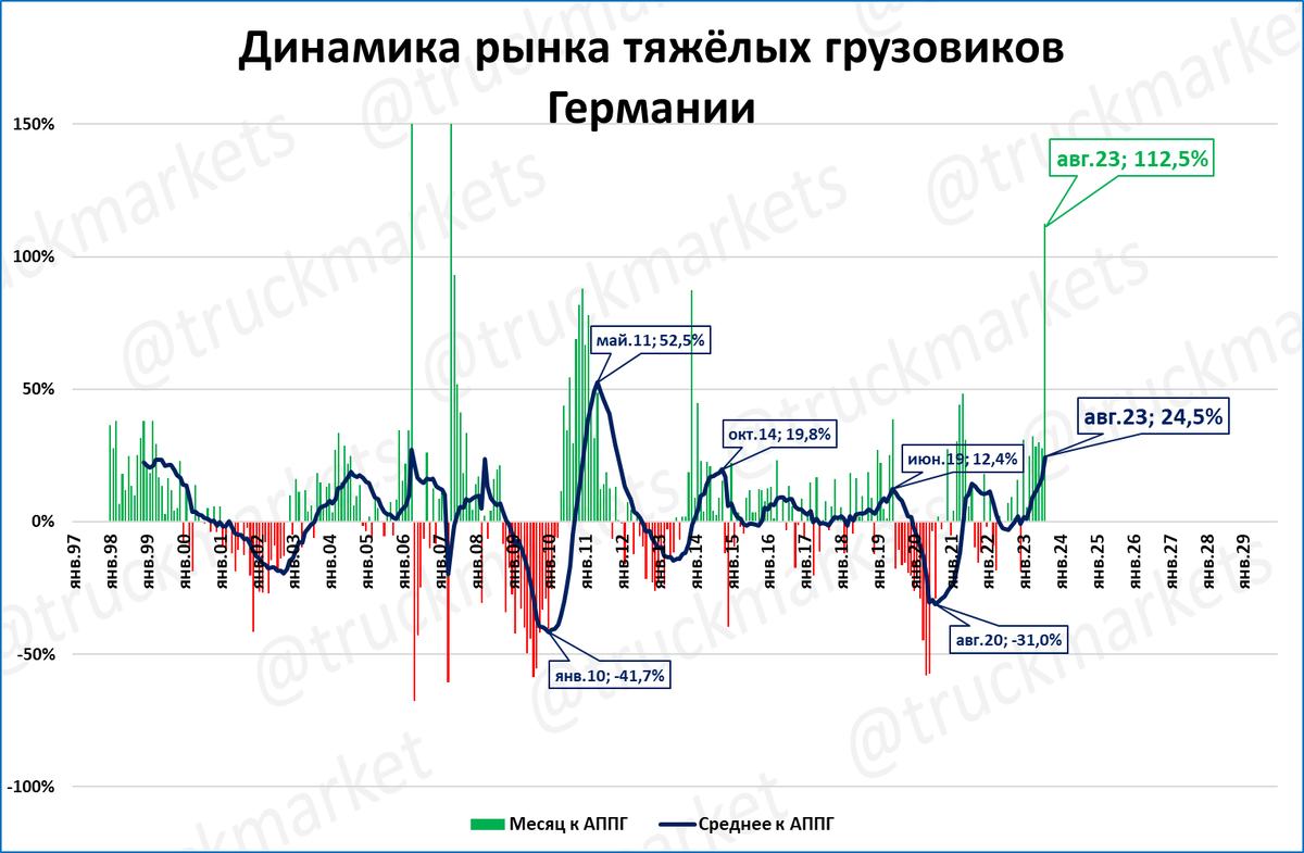 В Германии продажи тяжёлых грузовиков в августе стали рекордными с апреля 2016 года (за 17 лет) из-за эффекта предзакупок (введение «смарт-тахографа 2 типа» стало обязательным с 21 августа). Мы ожидаем, что в сентябре продажи грузовиков резко упадут.