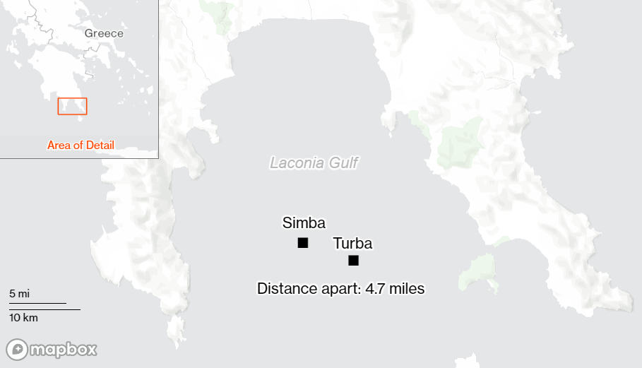 На прошлой неделе ложные сигналы «Турбы» были зафиксированы и отслеживались многочисленными известными системами слежения, в том числе одной, размещенной Bloomberg. Казалось, что он находится в нескольких милях от «Симбы», другого относительно старого, покрытого ржавчиной танкера, но на самом деле они находились бок о бок в Лаконическом заливе.