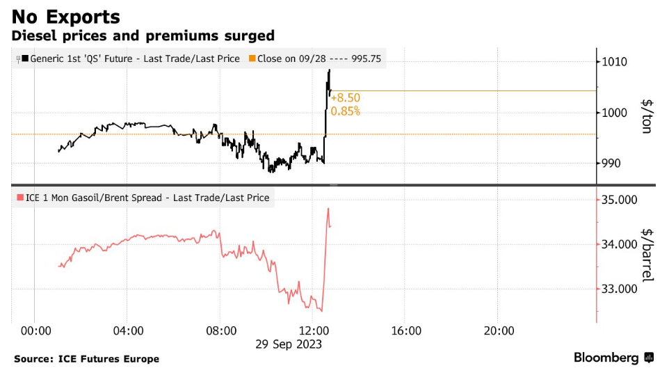 Цены на дизельное топливо в Европе резко выросли. Фьючерсы подскочили до 1008 долларов за метрическую тонну, увеличившись примерно на 16 долларов за несколько минут. Почему? Ну страна же бензоколонка. Россия является крупнейшим в мире морским экспортёром дизельного топлива.