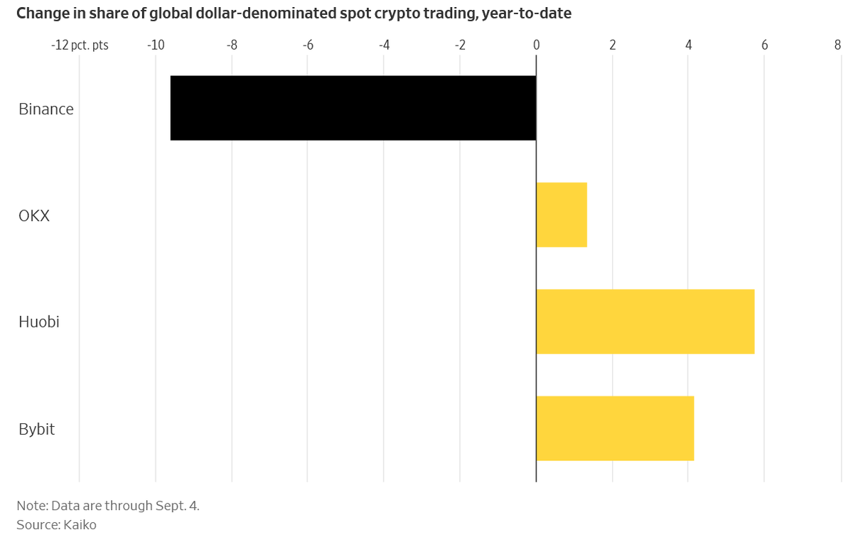 По данным поставщика данных Kaiko, в настоящее время на долю Binance приходится около половины всех сделок, в которых напрямую покупаются и продаются криптовалюты, по сравнению примерно с 70% в начале года.