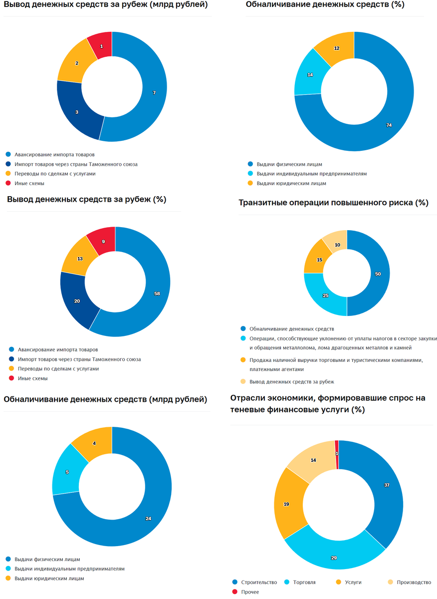 Объёмы обналичивания в банковском секторе снизились на 5% и составили 32 млрд рублей. Более чем в два раза сократился объем подозрительных операций по снятию наличных средств со счетов юрлиц. Этому способствовало оперативное доведение до кредитных организаций информации о высокорискованных клиентах через платформу «Знай своего клиента». Также вдвое по сравнению с первым полугодием прошлого года упали объёмы обналичивания с помощью исполнительных документов. Прежде всего — за счет законодательных изменений, которые дали банкам право не проводить операции по исполнительным документам при наличии подозрений, что их целью является отмывание доходов.