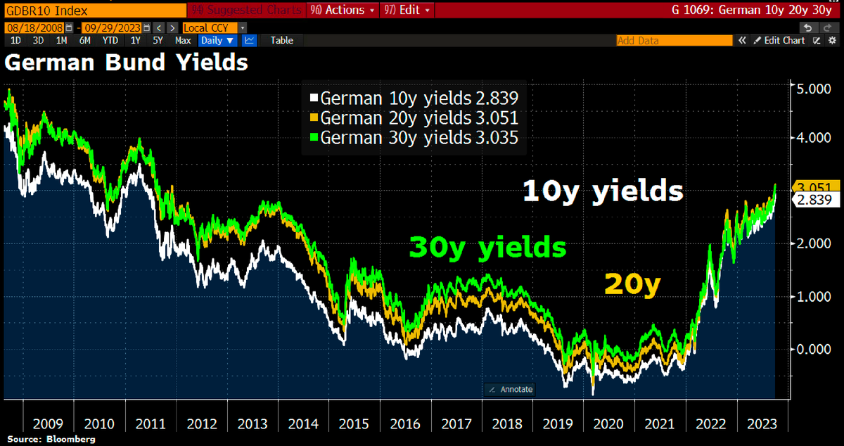 Доходность 20-летних и 30-летних облигаций Германии выросла до 3% и выше. Самый высокий показатель с 2011 года.