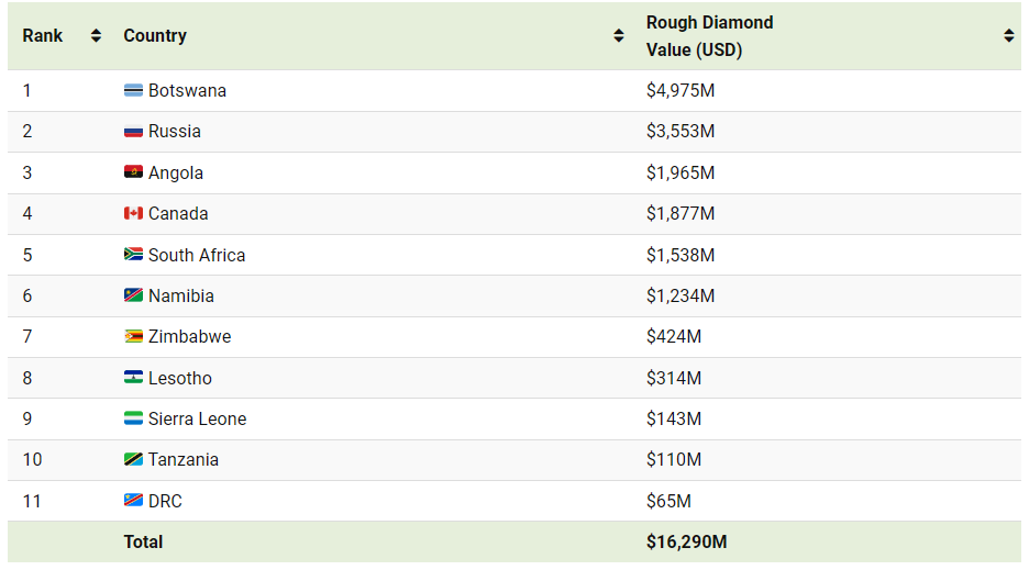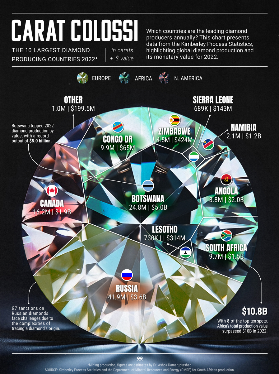 На долю 10 крупнейших стран-производителей алмазов по весу приходится 99,2% всех алмазов, добытых в 2022 году.