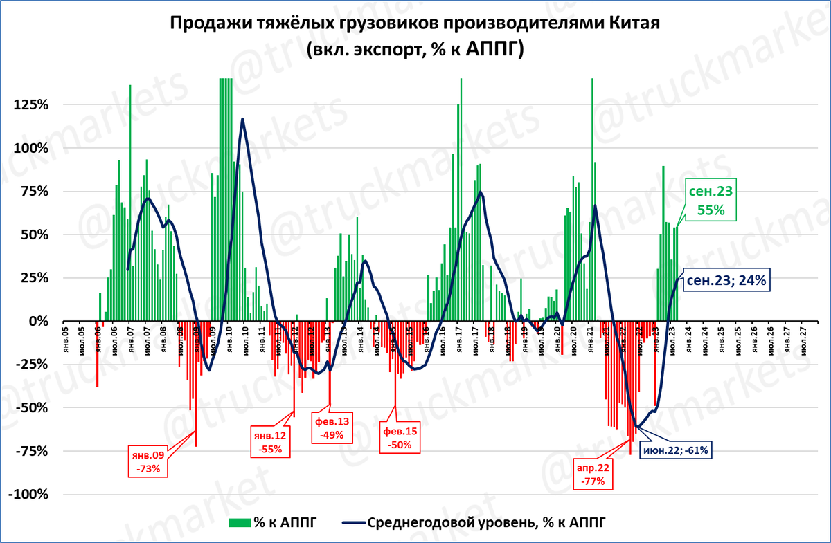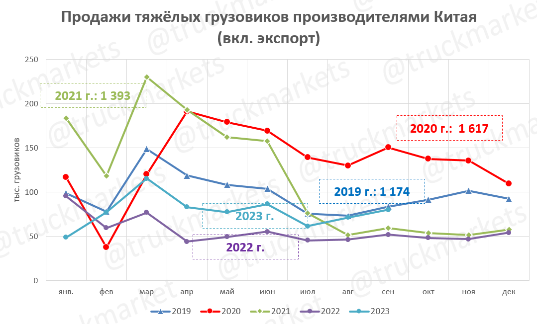 В сентябре китайские производители продали (на внутренний рынок и на экспорт) 80 тыс. тяжёлых грузовиков.