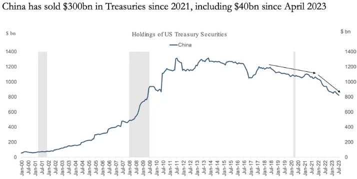 С 2021 года Китай продал казначейские облигации США на сумму 300 миллиардов долларов, добавил он, отметив, что в последнее время темпы продаж ускорились: с апреля этого года было продано бумаг на 40 миллиардов долларов.