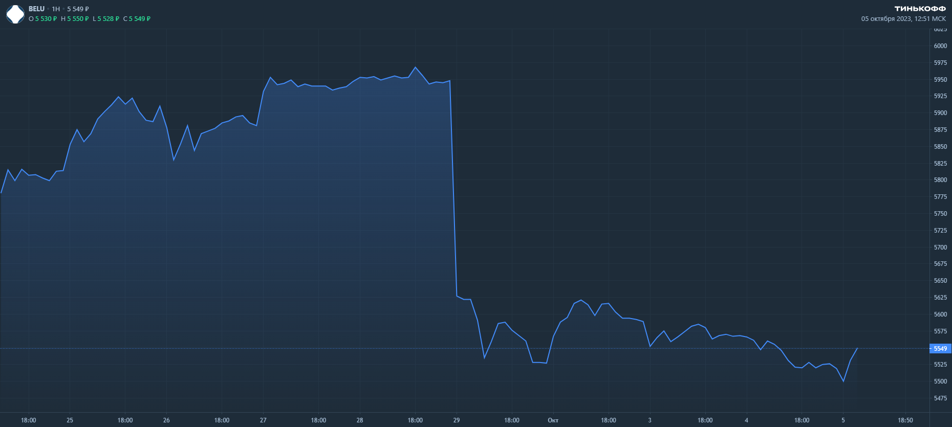 На прошлой неделе бумаги BELU упали после дивидендной отсечки на 6,5%. Компания выплатит по 320 рублей на акцию тем акционерам, у кого они были в портфеле 28 сентября. К 12:51 по мск бумаги торгуются по 5549 руб (+0,54%).