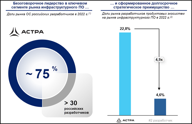 Группа стабильно увеличивает и без того существенный отрыв от ближайших конкурентов. В ключевом продуктовом сегменте — операционных системах — ОС Astra Linux в деньгах занимает порядка 75% рынка. Лидерство в этой категории — основа для увеличения доли группы в остальных сегментах рынка инфраструктурного ПО, где «Астра» также занимает ведущую позицию с рыночной долей порядка 23% среди российских разработчиков.
