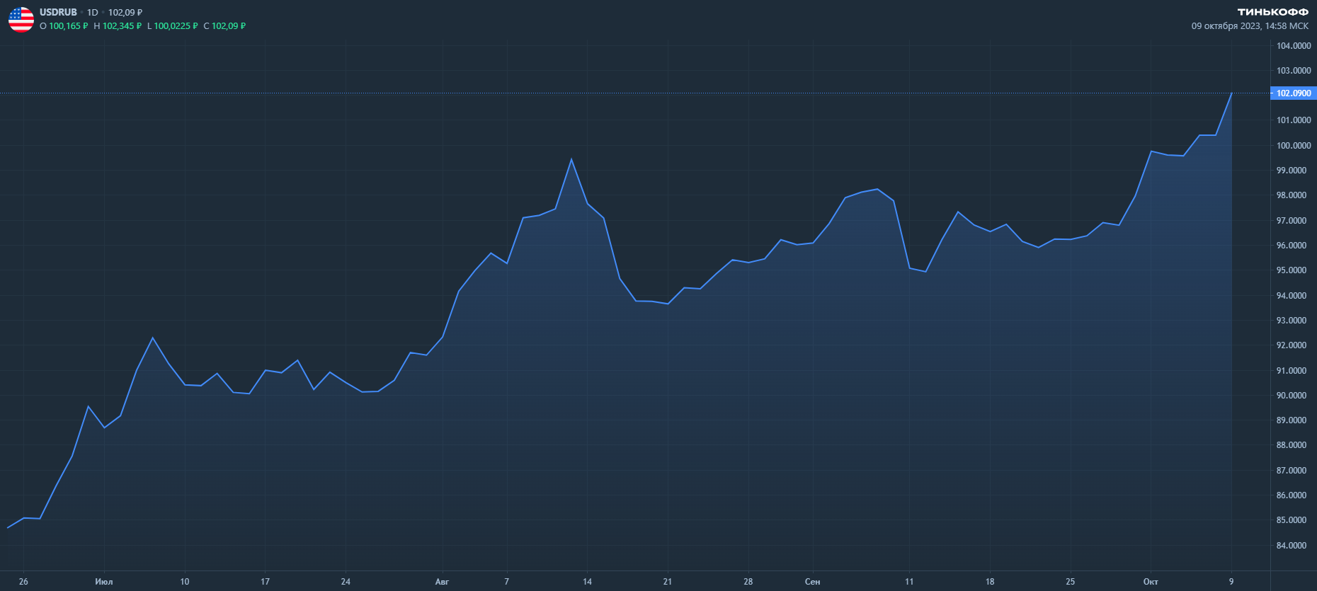 А вот реальный курс рубля сегодня побил годовой рекорд 14 августа. К 14:58 по МСК доллар стоит 102,09 руб (+1,67%). О причинах мы писали в конце прошлой недели.