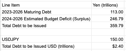 Ниже приводится моя оценка общего объема государственного долга, который должен быть пролонгирован и выпущен США, Китаем, Японией и ЕС для покрытия дефицита в период с 2023 по 2026 год. Я выбрал 2026 год в качестве конечной даты, поскольку средний срок погашения долга Америки, крупнейшего должника и главаря этой экономической системы, составляет около 3 лет. Все остальные страны/экономические блоки находятся в созависимых отношениях с Америкой, поэтому все они будут подниматься и падать вместе. Для получения информации о сроках погашения долгов всех остальных стран я использовал функцию DDIS на сайте Bloomberg.