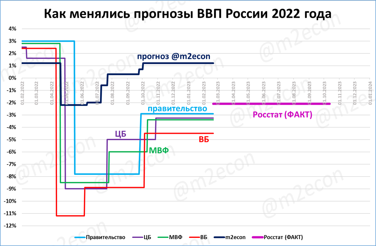 До начала СВО все прогнозы предполагали рост экономики России. Даже в феврале, за считанные дни до начала событий, никто падение ВВП не прогнозировал. Например, ЦБ 12 февраля понизил свой прогноз с +2,5% до +1,6%. Но и этот прогноз предполагал рост.