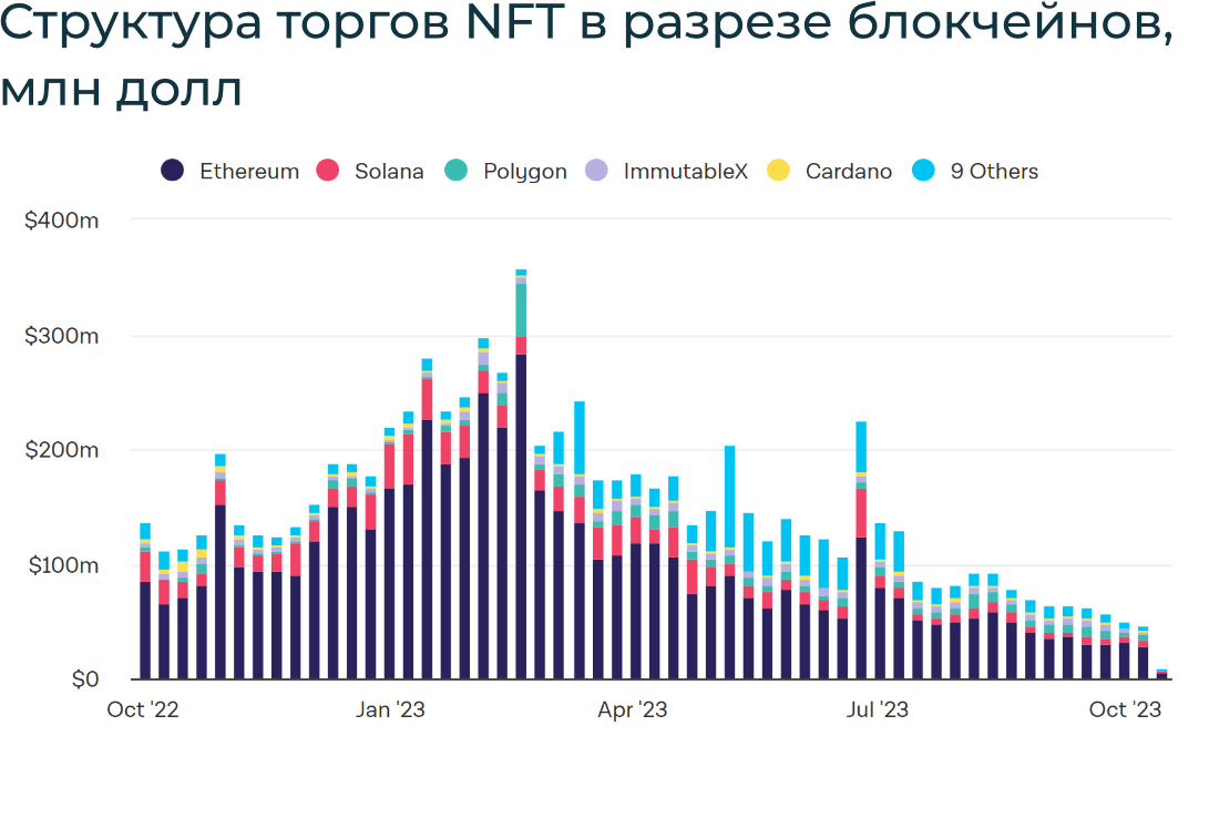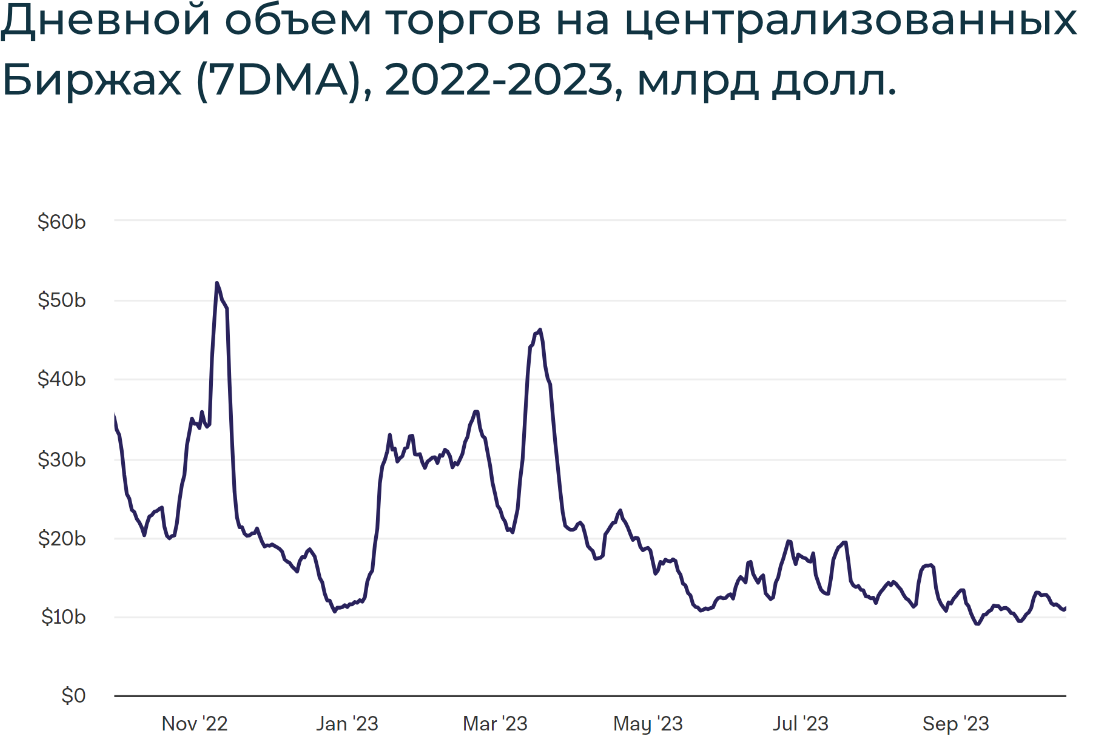 Общая капитализация криптовалютного рынка увеличилась на 1,4% – до $1,065 трлн. Цена BTC выросла на 2,1% до $28,1 тыс., при этом внутри недели пробив отметку в $30 тыс. после ложной новости от Cointelegraph о запуске спотового BTC-ETF. Цена ETH повысилась на 0,5% до $1,6 тыс. В конце недели доминация BTC (рыночная доля) незначительно увеличилась на 0,5% до 51,7%.
