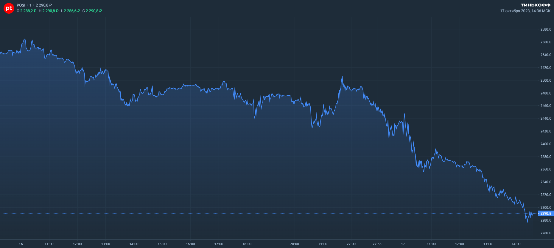 Вторую сессию подряд бумаги POSI падают. К 14:36 по мск их цена — 2290,8 руб (-5,86%).
