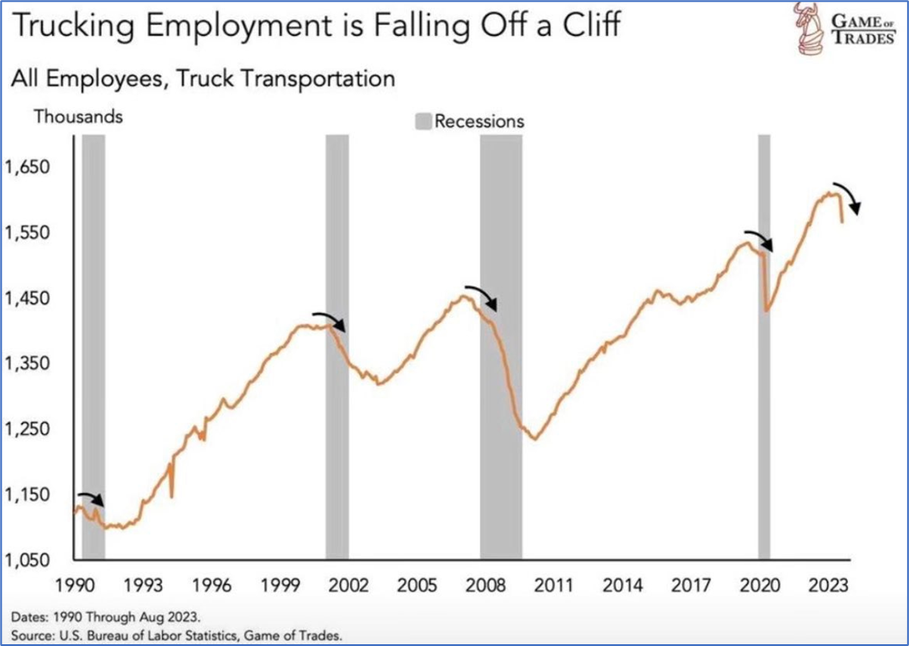 Следующий график показывает другую закономерность: падение занятости в сфере автоперевозок предшествует рецессиям в США.