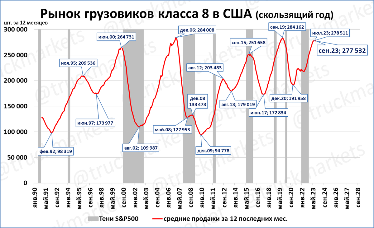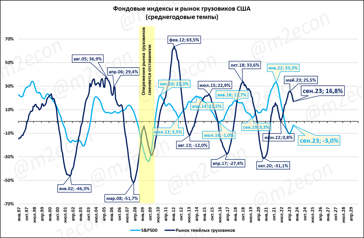 Тенями на графике выше показаны периоды, когда американский фондовый индекс S&P500 падал в годовом выражении. Как видно, в 2000 и 2006 годах после пика рынка наблюдались долгие падения фондового индекса S&P500. Однако чёткой взаимосвязи падения рынка грузовиков с падением фондового индекса далее не прослеживается.