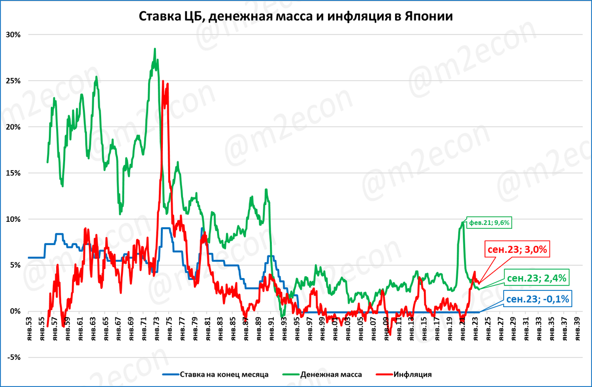 Денежная масса Японии в сентябре (+2,4% годовых) по-прежнему росла медленнее цен (+3% годовых).