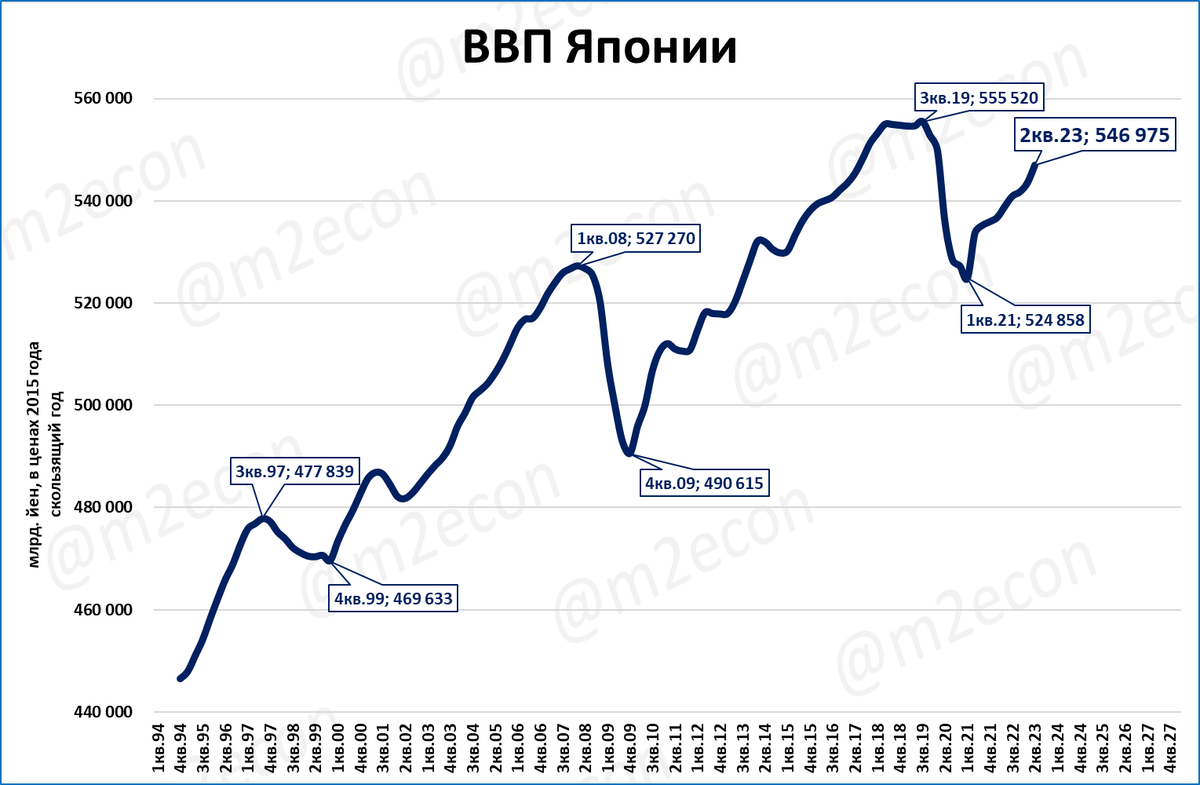 Четырёхквартальный ВВП сейчас (547 трлн йен 2015 года) ниже, чем по итогам третьего квартала 2019 года (556 трлн).