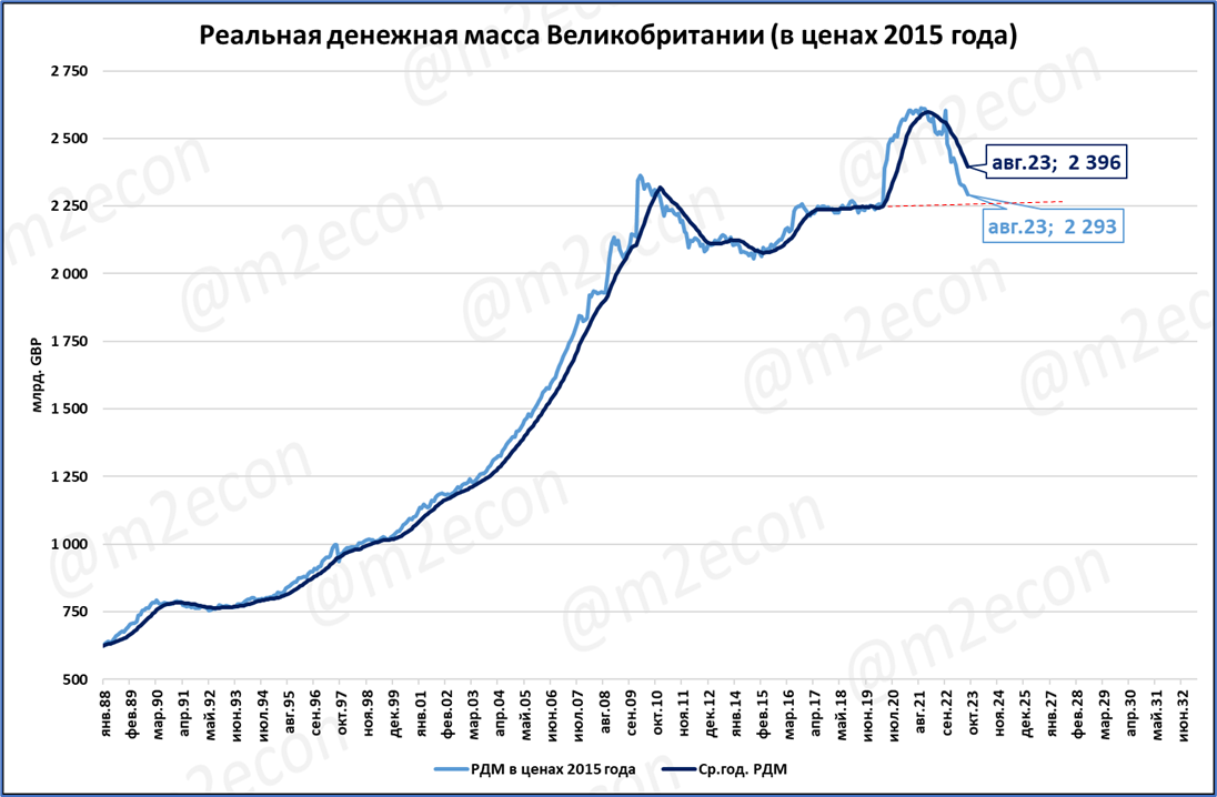Несмотря на столь сильное падение, на свой «доковидный» тренд (пунктирная линия на графике) реальная денежная масса всё ещё не вернулась.