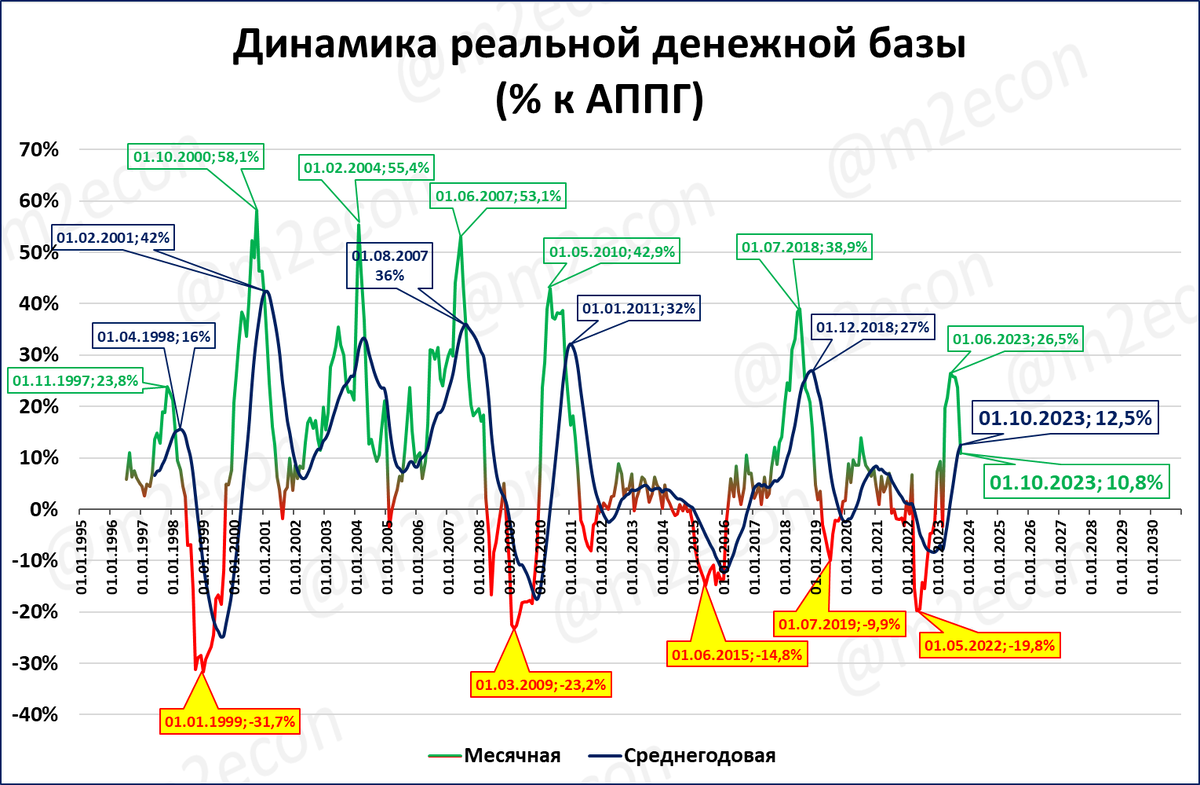 Текущие темпы роста уже ниже среднегодовых темпов (зелёная линия графика опустилась ниже синей), что часто предшествует падению реальной денежной базы.