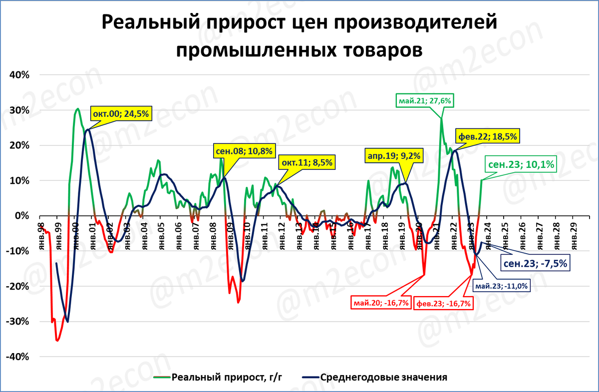 Реальный рост цен производителей – позитивный для экономики сигнал. И, наоборот, когда реальные цены производителей падают, это, как правило, говорит о том, что ситуация с продажами у производителей настолько плоха, что они в отпускных ценах не могут даже компенсировать обычную инфляцию.