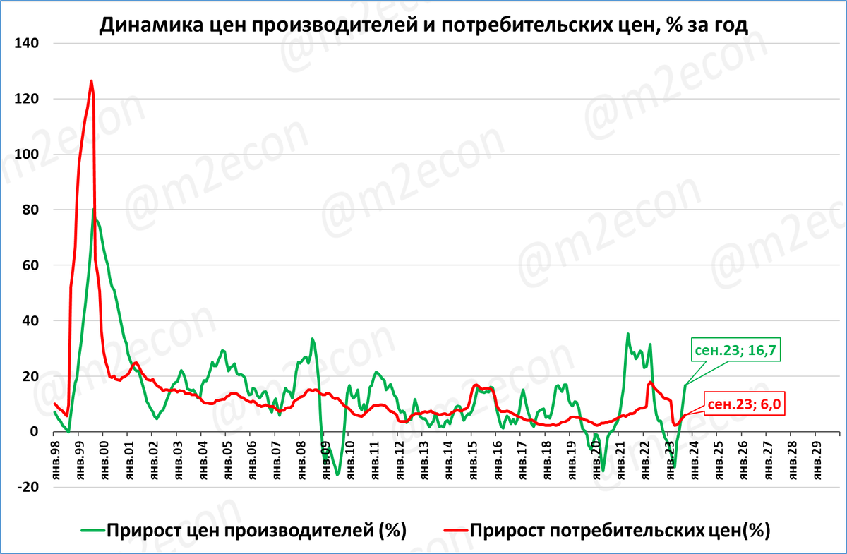В сентябре рост цен производителей составил 16,7% годовых.