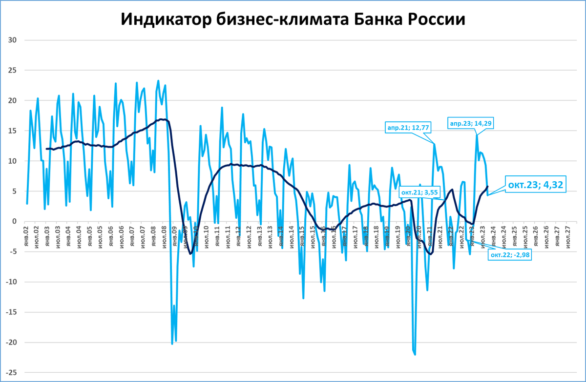 Кажущееся падение индикатора (голубая линия на графике) – следствие сезонности. Если сравнить индикатор с октябрём 2021 года (3,55 пункта), то нынешний намного выше. Не говоря уже о сравнении с октябрём 2022 года (-2,98 пункта).