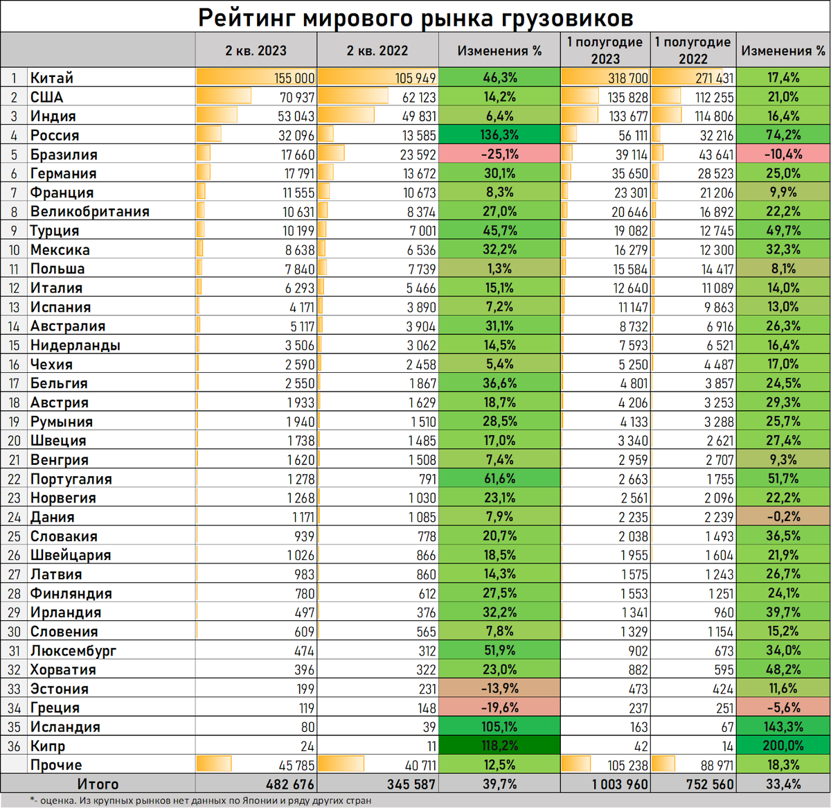 В мировом рейтинге по объёму рынка тяжёлых грузовиков за первое полугодие 2023 года лидируют Китай, США и Индия. Россия в первом квартале обошла Бразилию и поднялась с пятого на четвёртое место. По итогам полугодия она это место сохранила, увеличив отрыв.