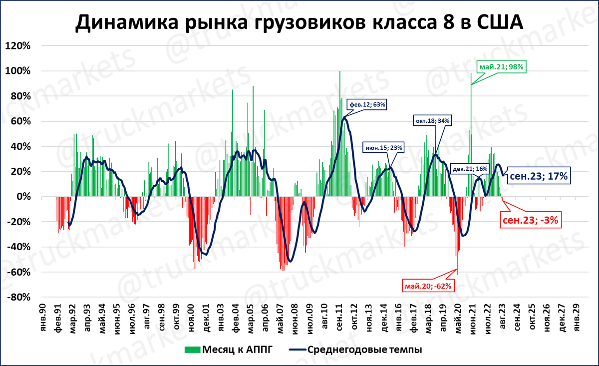 Тенями на графике выше показаны периоды, когда американский фондовый индекс S&P500 падал в годовом выражении. Как видно, чёткой взаимосвязи падения рынка грузовиков с падением фондового индекса не прослеживается.
