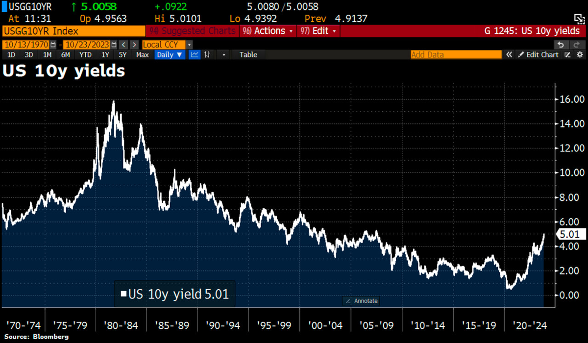 Доходность 10-летних американских казначейских облигаций впервые с 2007 года достигла 5%. Событие отмечается всем западным соцмедиа сообществом.
