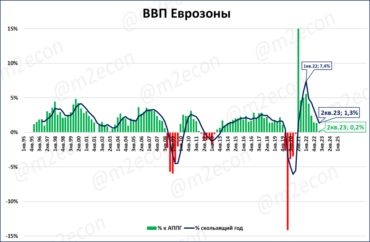 Это основная причина резкого замедления роста ВВП Еврозоны (см. график ниже) и падения деловой активности (см. сюжет выше).