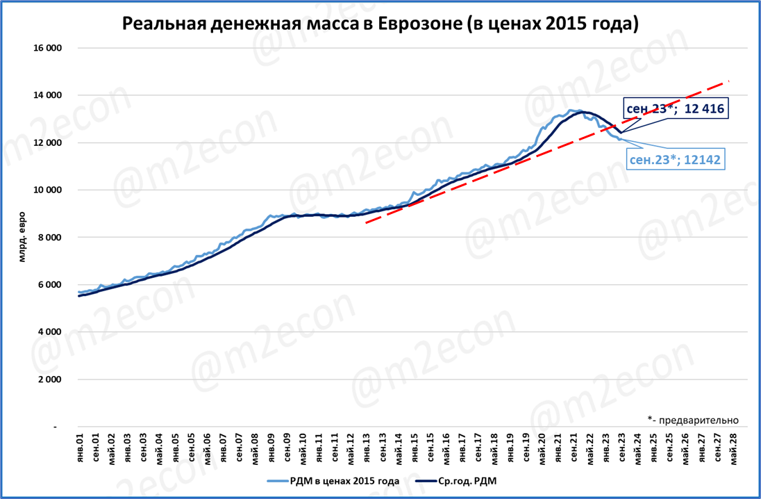 Сжатие реальной денежной массы в Еврозоне продолжается с марта 2022 года (19 месяцев).