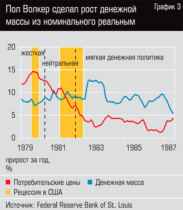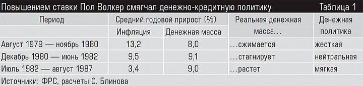 Второе отличие: не было снижения роста денежной массы. Наоборот, с 8% годовых рост денежной массы ускорился при Волкере до 9%, а позже и до 12% годовых (см. таблицу и график ниже).