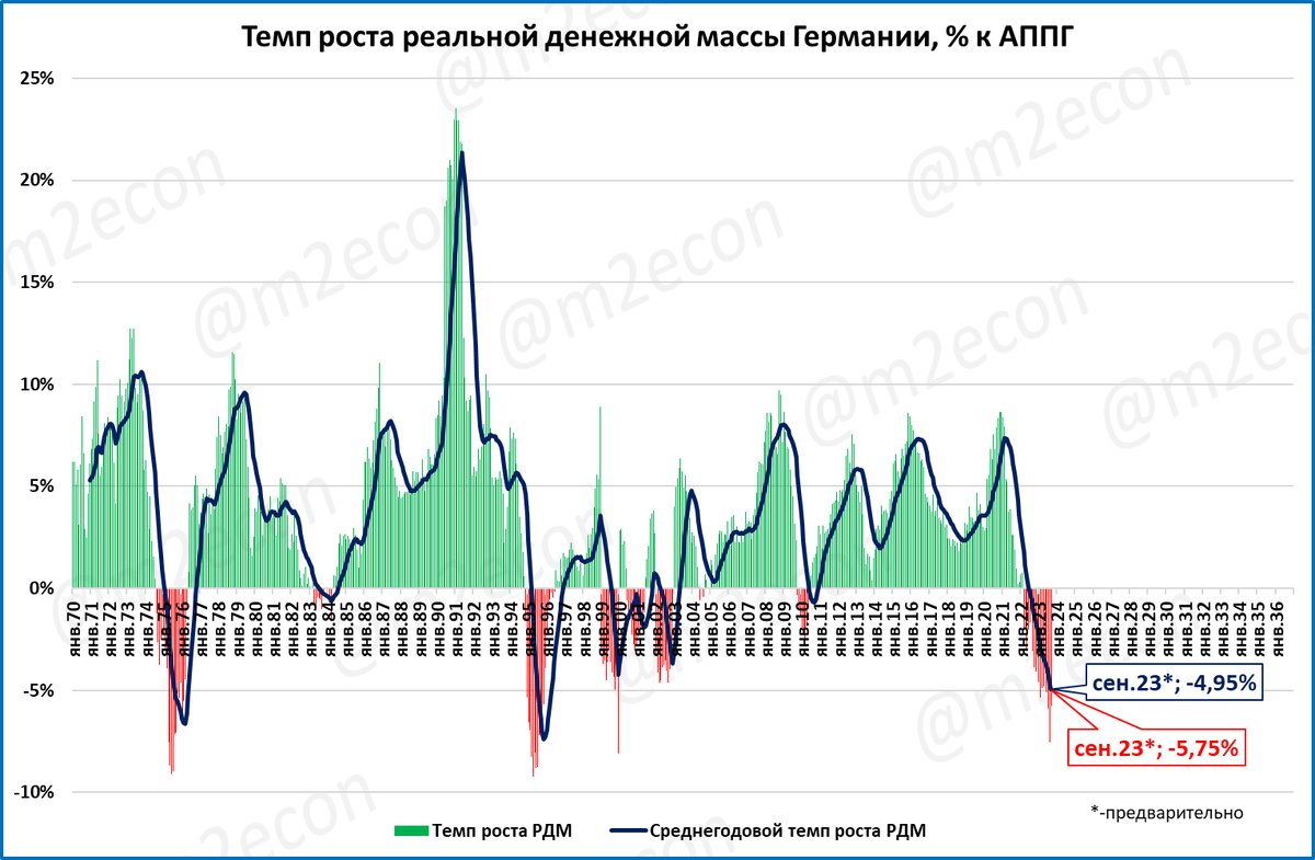 Денежная масса в Германии сжалась в сентябре на 1,5% к сентябрю прошлого года.